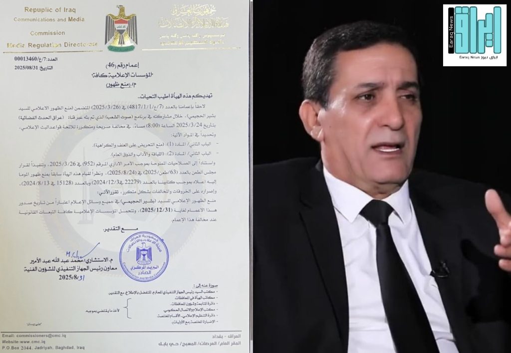 إيراق نيوز .. أعلنت هيئة الإعلام والاتصالات منع ظهور المحلل السياسي بشير الحجامي عبر وسائل الإعلام حتى نهاية عام 2025، وذلك على خلفية تصريحات مسيئة لمحافظة النجف، مؤكدة أن القرار يأتي ضمن إجراءاتها لضبط الخطاب الإعلامي وحماية السلم المجتمعي.