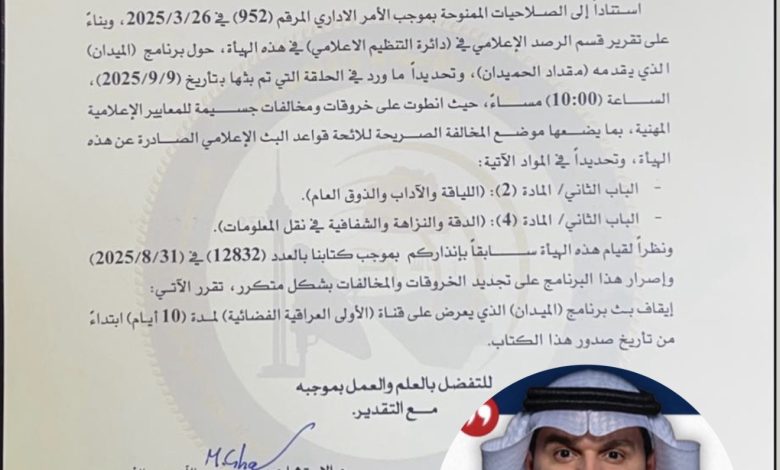 إيراق نيوز .. قررت هيئة الإعلام والاتصالات العراقية إيقاف بث برنامج الميدان الذي يقدمه الإعلامي أحمد حمدان على قناة الأولى العراقية الفضائية، وذلك لمدة عشرة أيام اعتبارًا من 15 أيلول 2025.