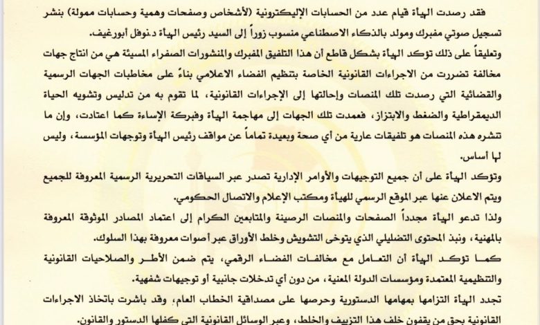 إيراق نيوز .. فقد رصدت الهيأة قيام عدد من الحسابات الإليكترونية (لأشخاص وصفحات وهمية وحسابات ممولة) بنشر تسجيل صوتي مفبرك ومولد بالذكاء الاصطناعي منسوب زوراً إلى السيد رئيس الهيأة د.نوفل أبورغيف.