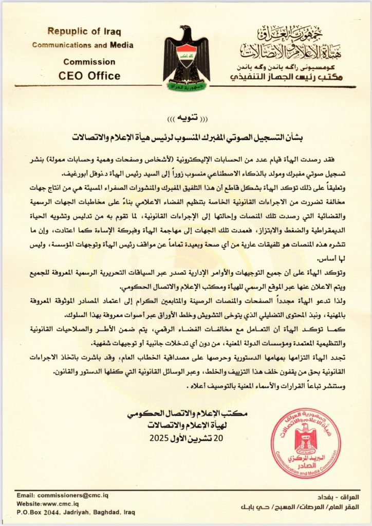 إيراق نيوز .. فقد رصدت الهيأة قيام عدد من الحسابات الإليكترونية (لأشخاص وصفحات وهمية وحسابات ممولة) بنشر تسجيل صوتي مفبرك ومولد بالذكاء الاصطناعي منسوب زوراً إلى السيد رئيس الهيأة د.نوفل أبورغيف.